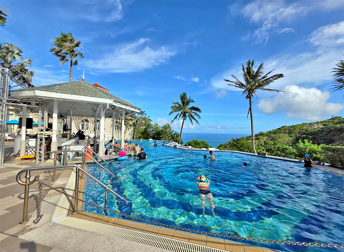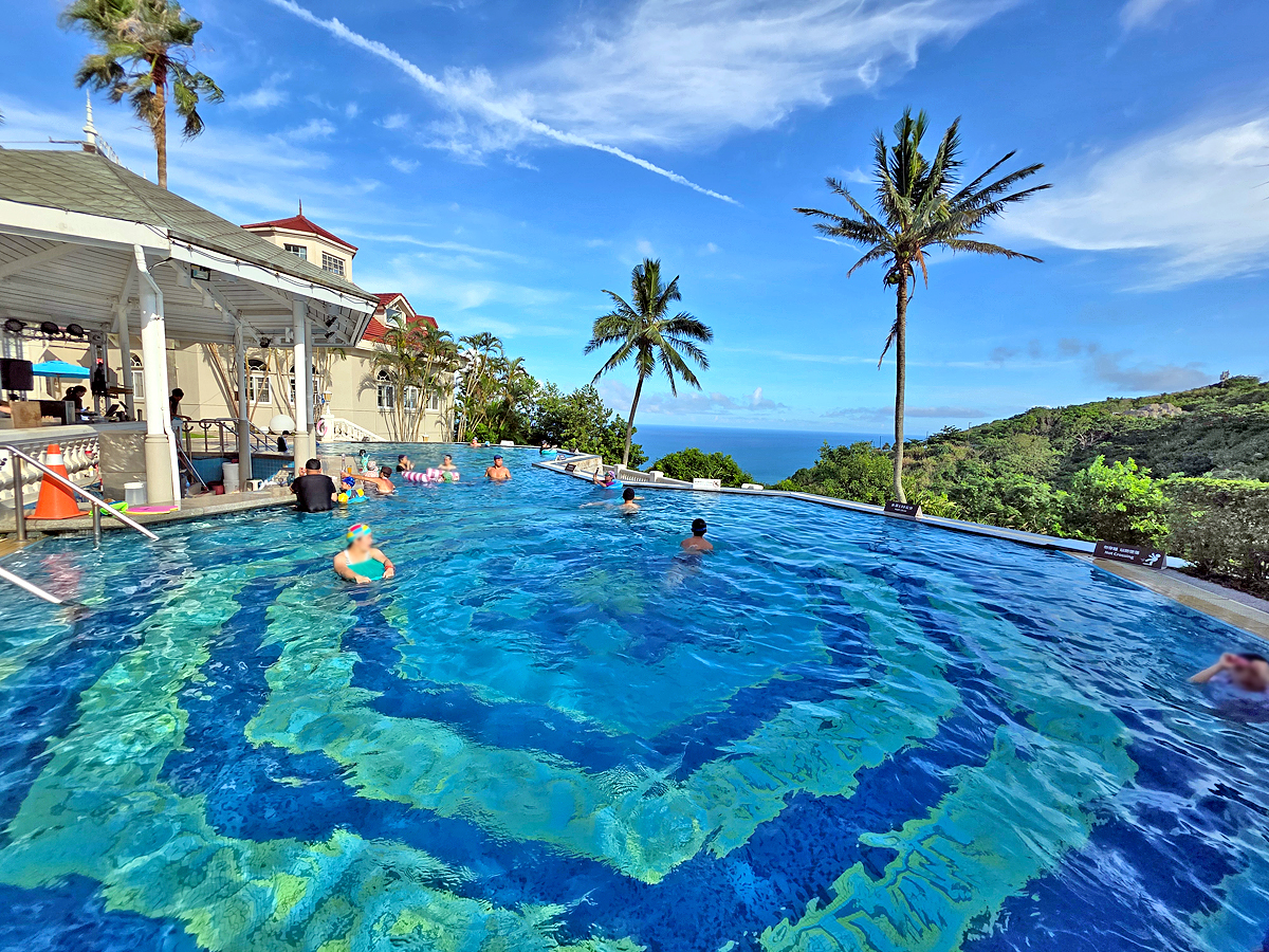 遠雄悅來大飯店的戶外泳池真的很美!搭配前方海景,充滿悠閒渡假風情。