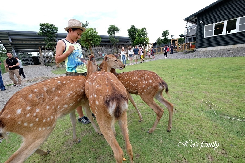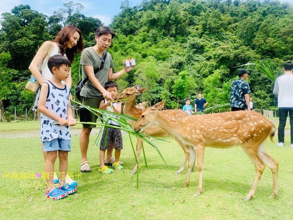 戶外庭園空間寬敞不擁擠,整體乾淨舒適,小鹿就在裡面悠閒散步,小朋友們等不及要與牠們互動餵食了。入園全票可兌換一份飼料(牧草、胡蘿蔔、地瓜3選1),梅花鹿其實是心細又謹慎的動物,帶小朋友來記得提醒不要追逐或嚇到牠們哦。