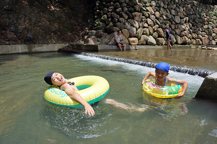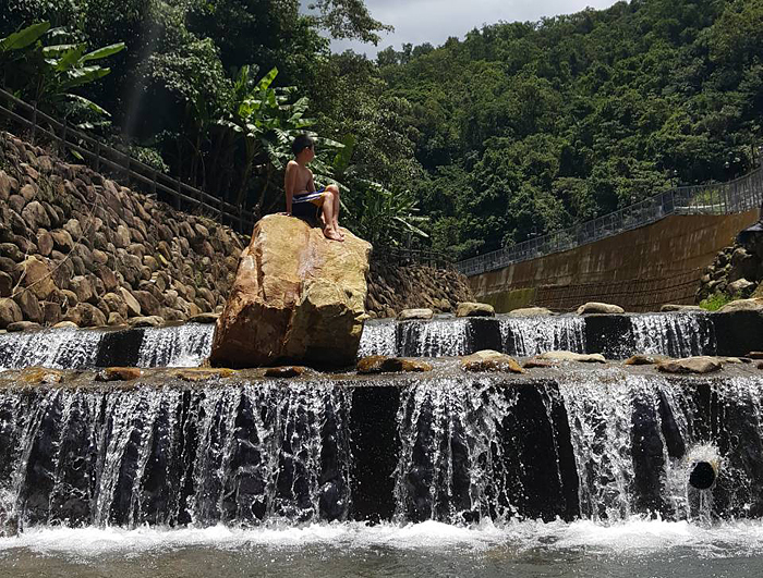 一旁的溪流清澈淺緩是夏天最受大小朋友喜愛的地方。