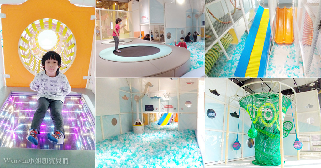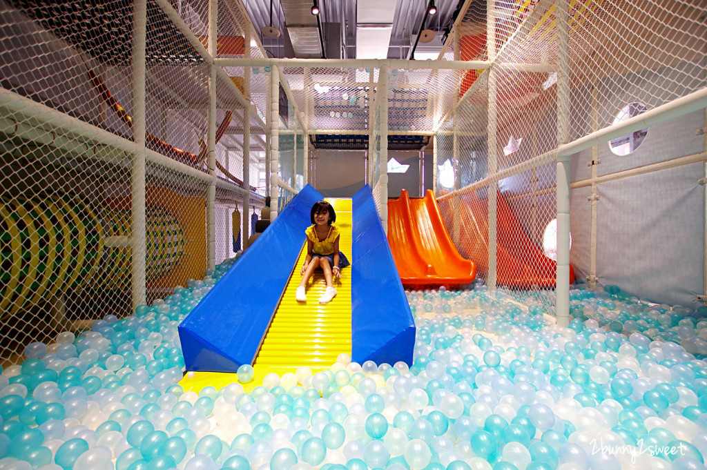 遊戲區以清爽色系為主,有彈跳床、大型溜滑梯球池、吸球機、互動投影遊戲、繩網闖關、攀爬繩網、擺盪彈力球、廚房組、積木、附挖沙玩具的沙坑、繪本...等遊樂設施。
