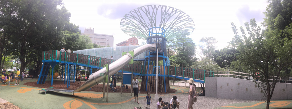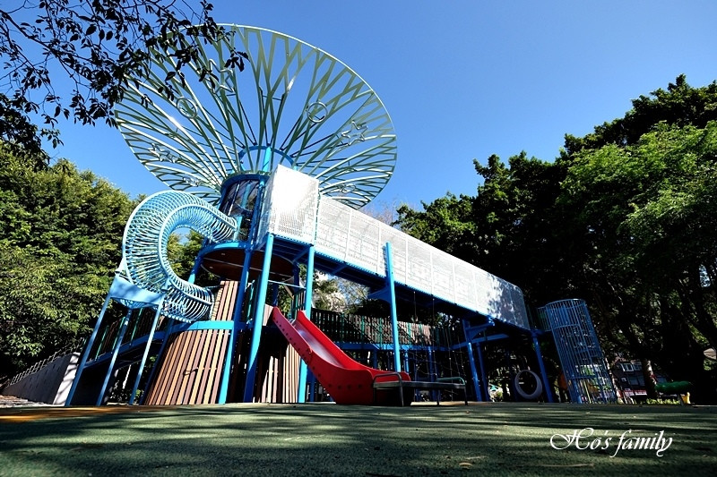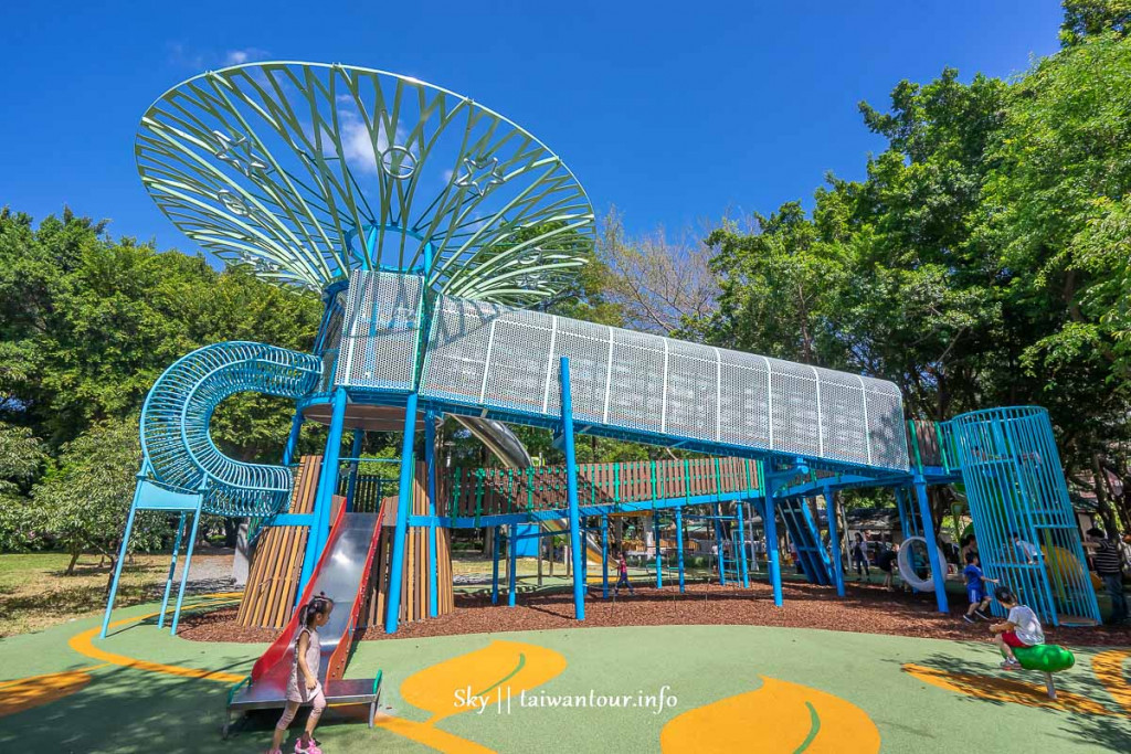 獨特造型的天空樹好吸睛,遊樂設施也很多元,要玩天空樹可走斜坡步道,或是攀爬而上,每個年齡層的小朋友都可找到適合的玩法。