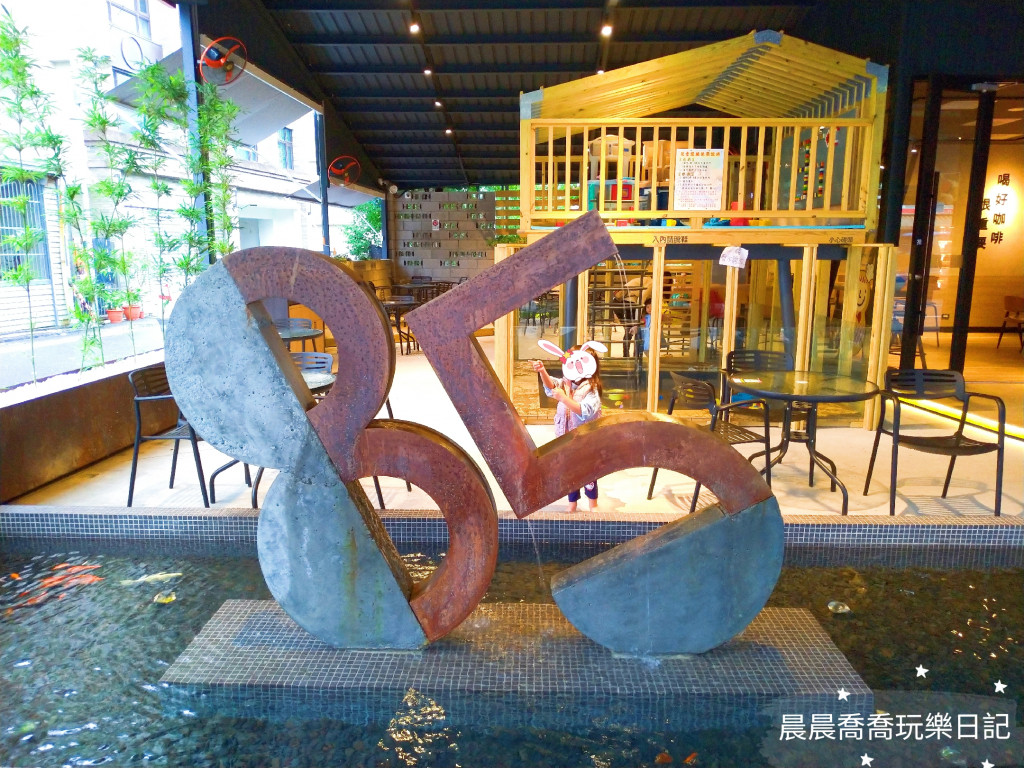 咖啡廳分為半戶外與室內空間,兒童遊戲區在半戶外空間內,是一間可愛的2層樓小木屋,1樓是附挖沙玩具的決明子沙坑,2樓有軟式大積木、積木牆與廚房扮家家酒組,木屋前方還有個小魚池可以讓小朋友看魚餵魚。