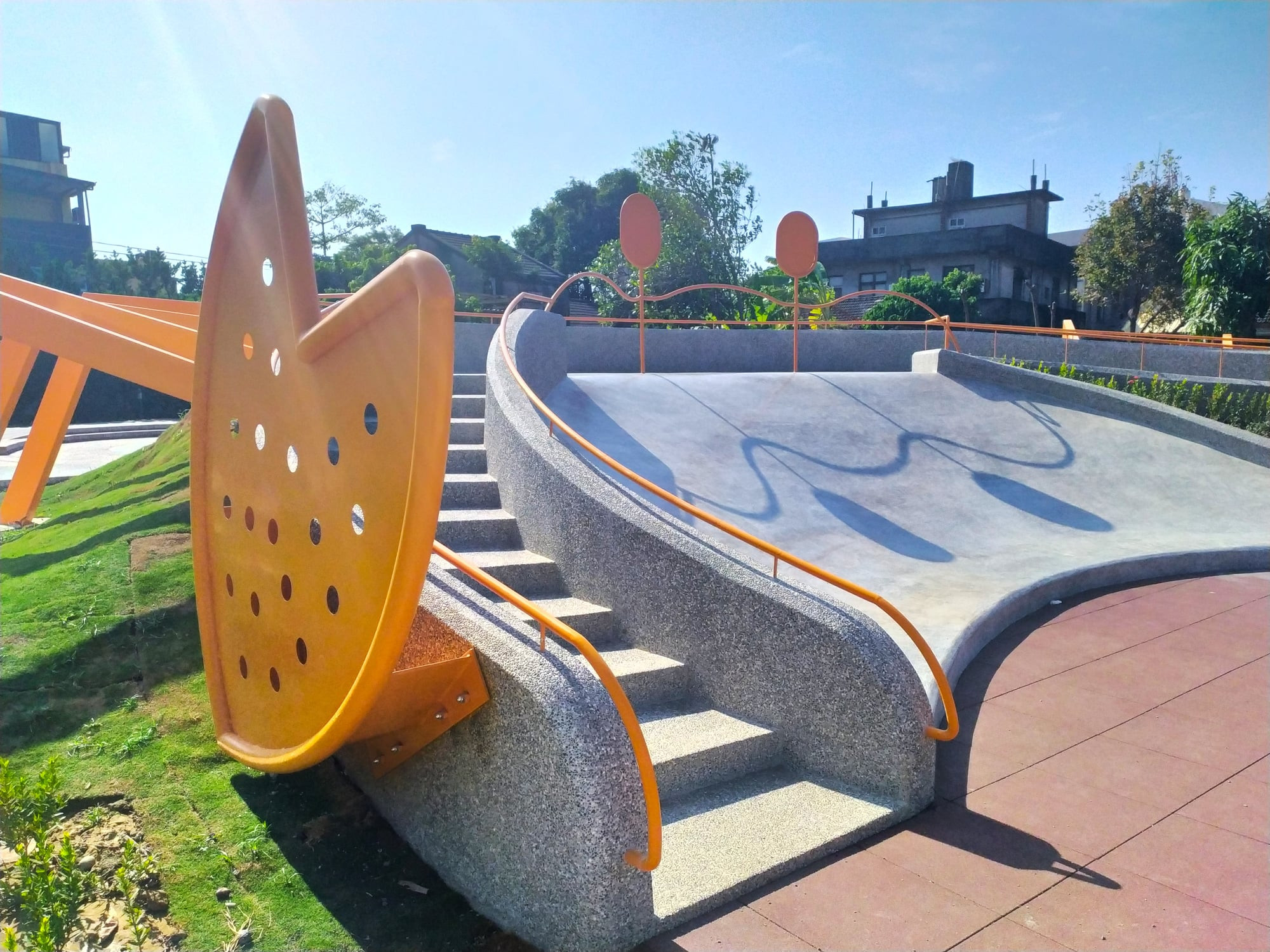 兒童遊戲場有一個大大的碗公溜滑梯,溜滑梯是醒目的螃蟹造型,寬面滑梯可以一次多個小朋友共玩,滑梯設置階梯與坡道二種方式,讓小朋友來回遊玩。