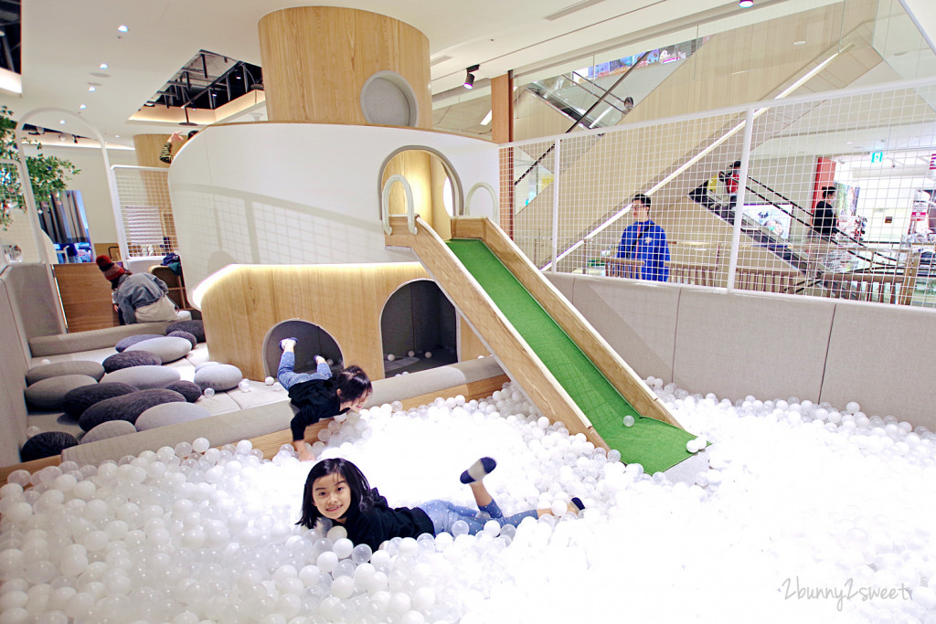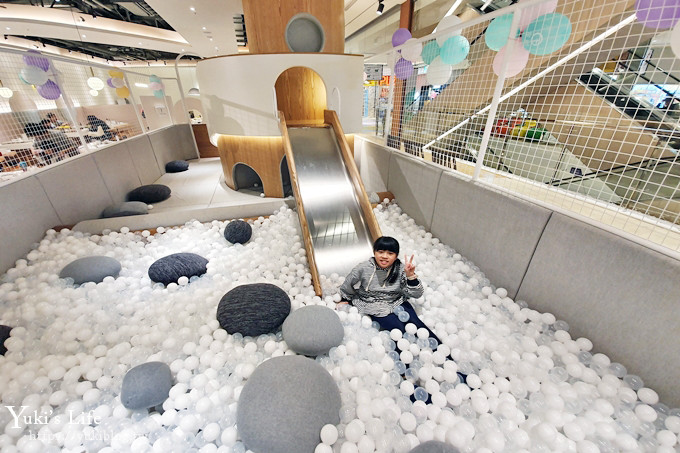 店內裝潢簡潔無過度裝飾,白色系北歐自然風格很清爽,每桌之間保留一定的間隔。兒童遊戲區就在入口處左側,有溜滑梯、白色與透明球池,還有不少仿石頭紋路的抱枕,讓坐不住的小朋友可以來遊玩放電。