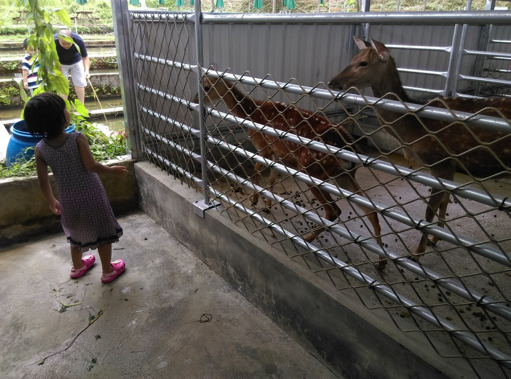 全新規劃的梅花鹿在釣魚池後方小山坡處,入園費可體驗梅花鹿餵食,可選擇紅蘿蔔或牧草。另外還有水豚、小兔子、麝香豬、鴨子等動物。用餐的話這裡有烤雞、烤魚餐2種選項,套餐含3菜1湯,用餐點加上玩水,這裡可以待上半天以上。