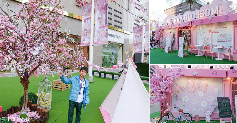 台中場就在廣三SOGO 1樓戶外廣場,人工草皮上擺上純白帳篷、粉色三角旗、野餐桌、櫻花樹等造景,也有野餐籃、小花等小道具讓大家拿取拍照,百貨的大門處也有好拍的櫻花造景呢。