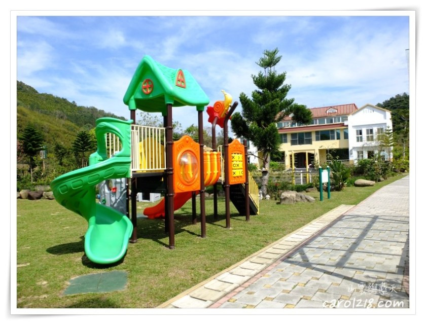 民宿有寬敞的戶外庭園空間,景色宜人、氣氛悠閒。戶外遊戲區有溜滑梯、攀岩牆、盪鞦韆、蹺蹺板、搖搖馬、單槓、戲沙坑,以及可以奔跑的草皮空間,還有魚池可以讓小朋友餵魚。