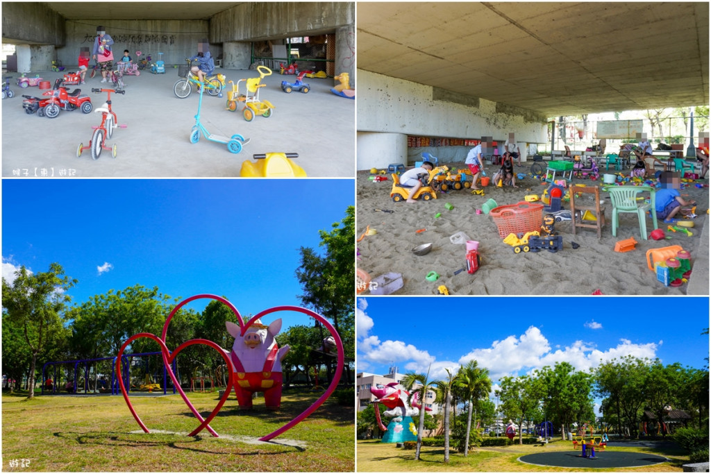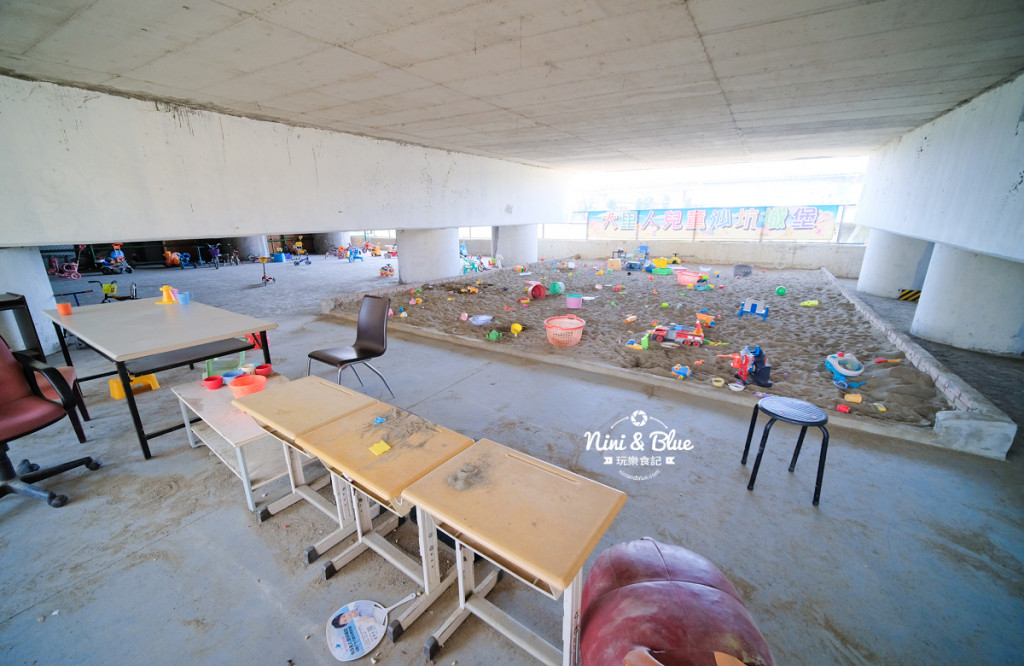 戲沙區設在陸橋下方,外面設有網門防止貓狗入內,大大的沙坑擺放不少挖沙玩具,橋下不怕日曬雨淋,是小孩的玩沙天堂,一旁空曠處則擺放多種造型滑步車與學習腳踏車給小朋友玩。