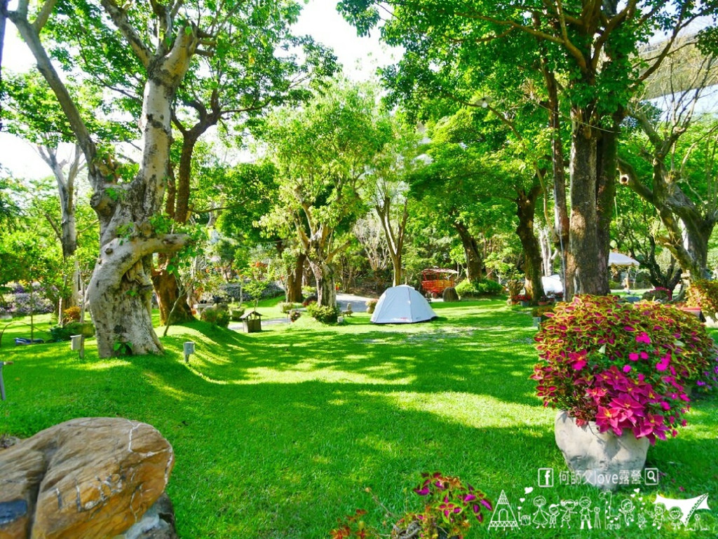 營主善長景觀設計,所以營地裡設計很有巧思,厚實草皮、茂密樹林、景觀小湖以及好拍的造景設計,優美又漂亮。小朋友在這裡更能開心玩,有戲水池、沙坑、海馬遊憩草皮、小象溜滑梯、搖搖馬,半室內空間另有彈珠台、射飛鏢、手足球桌、冰球桌,還有面具彩繪DIY。