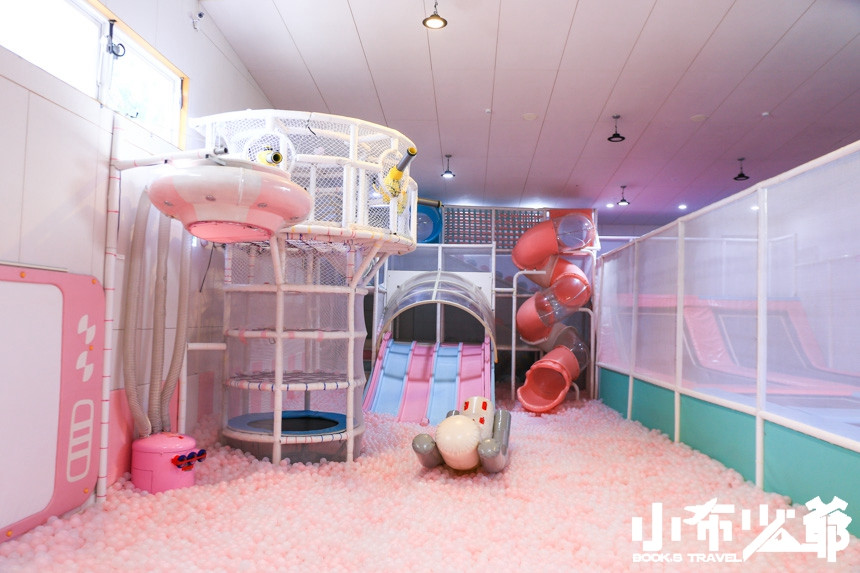 店內不論是餐廳或遊戲室都是女孩兒愛的粉嫩色系,很有質感。兒童遊戲區分為1、2樓,1樓為動態區,有大溜滑梯球池、瀑布球機、海綿池、彩虹繩網、香蕉船、射球機、彈跳床等。