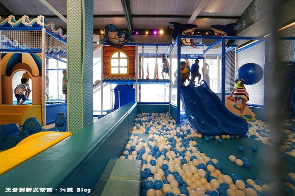 兒童遊戲區位在2樓,只要用餐消費滿200元,就能免費入場遊玩。海洋風遊戲區有藍白球池、溜滑梯、搖搖馬、大球、廚房組、塗鴉黑板、彈跳床、積木牆等遊樂設施。