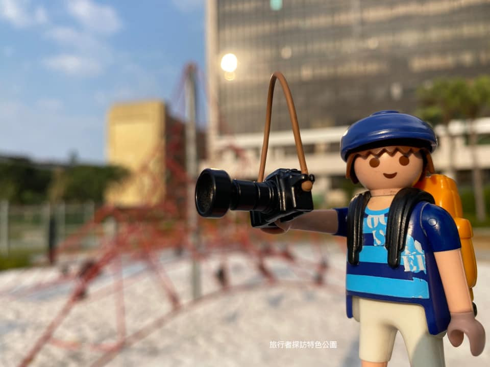 公園內也有設置特色遊具,有一座礫石舖面的三角攀爬網架、尿布鞦韆、平板鞦韆、搖擺吊床、搖擺遊具、幸運餅乾溜滑梯等。其中幸運餅乾溜滑梯造型特別,小朋友可以體驗爬、溜、躲藏等多元遊樂。