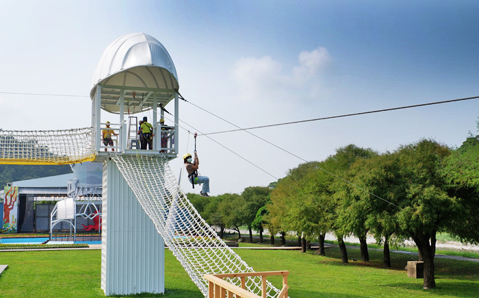 在稻草怪旁是第二座主題館「唐吉訶德闖關區」,裡面是由貨櫃組成的闖關遊戲區。開放時間09:00-11:00、13:30-16:00,小朋友6歲以上就可以玩了,大人也可挑戰,是很熱門的設施,建議早點入園先來玩,才不會排太久。