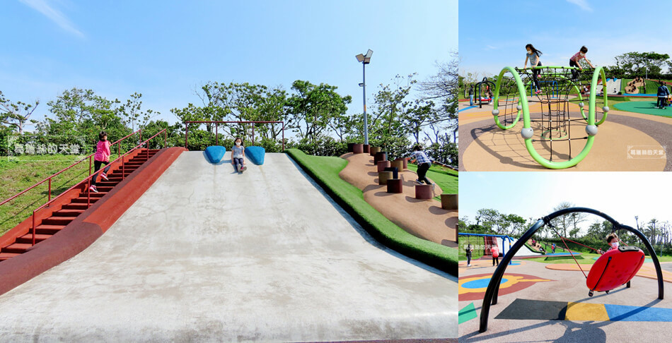 公園內有兒童共融遊戲場、環園步道、大草皮空間、天幕平台以及綠丘遊戲區等。兒童遊戲場有一座依地形而設的磨石子溜滑梯、跳樁以及攀爬網,前方有立體攀爬架、圓盤鞦韆、一般鞦韆、蹺蹺板等,也有塑膠溜滑梯遊戲組。
