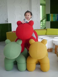大廳空間很大,半圓形大沙發不只好看,更讓人想坐在上面休息放空,三隻動物造型椅是小朋友的最愛,一旁提供大人小孩的書本,坐在落地窗旁進行共讀,享受美好的親子時光。
