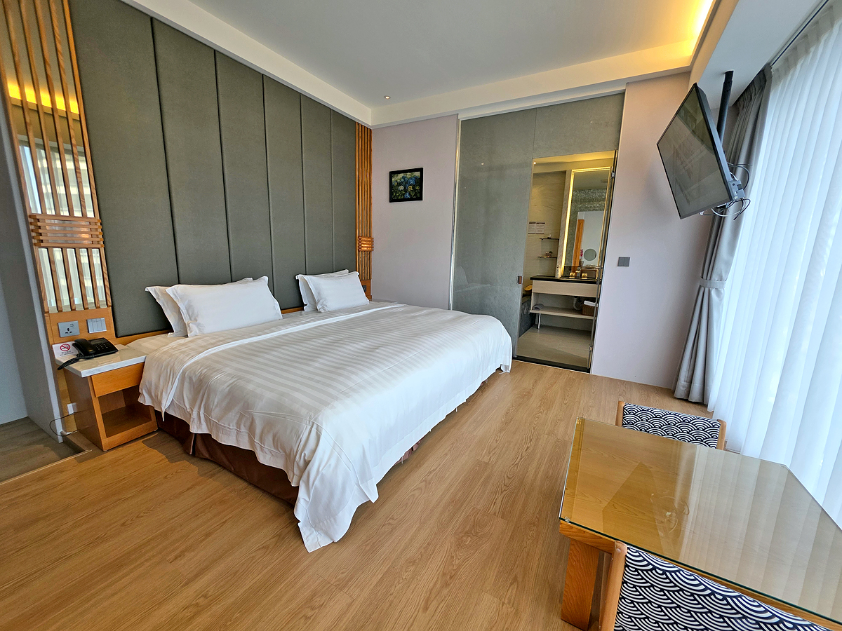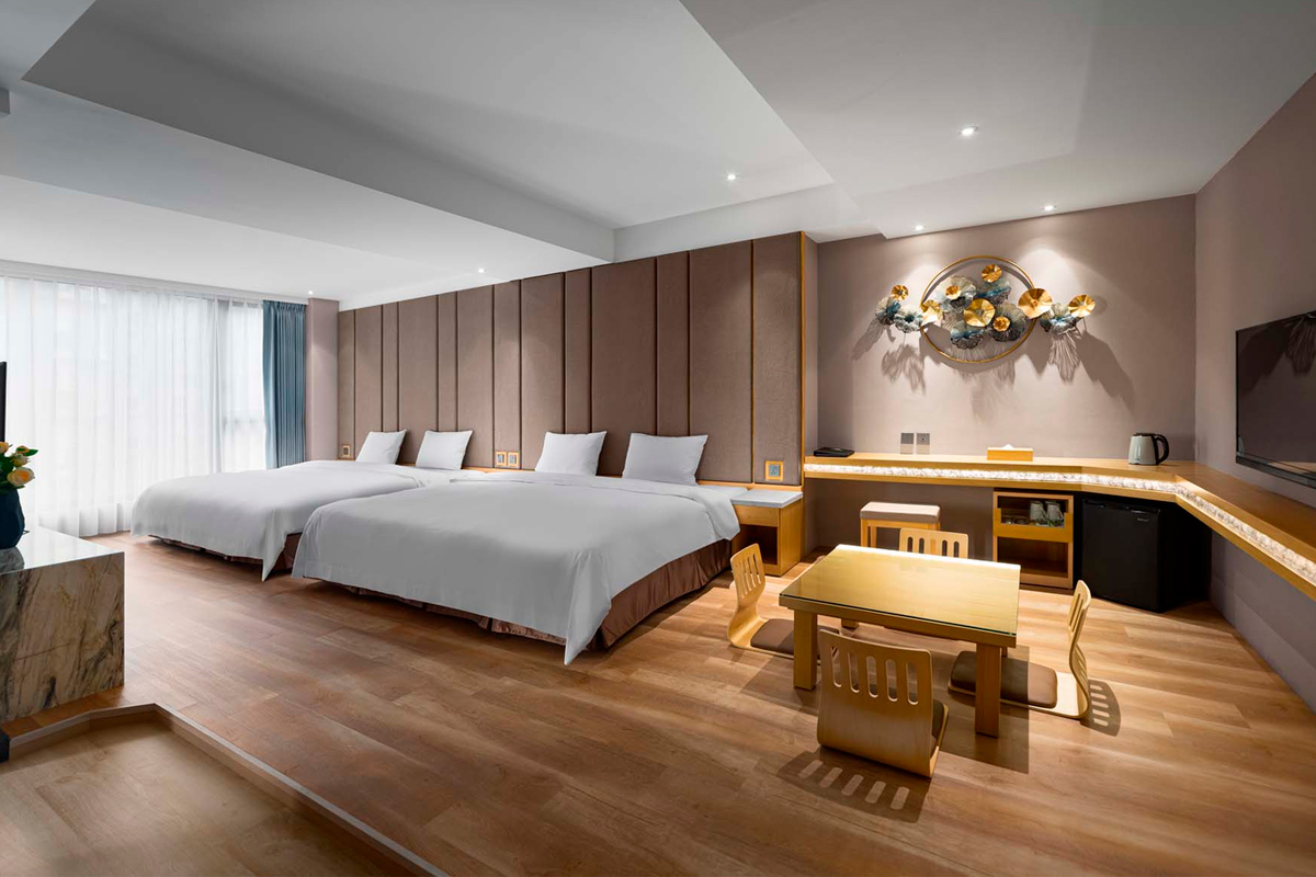 飯店內有雙人及四人房型,房內以木質裝加上明亮採光,打造舒適的空間,房內擺放和式桌椅,帶點日式風情,房內泡湯池不小,小朋友開心玩水,爸媽則可放鬆享受,消除工作累積的壓力。
