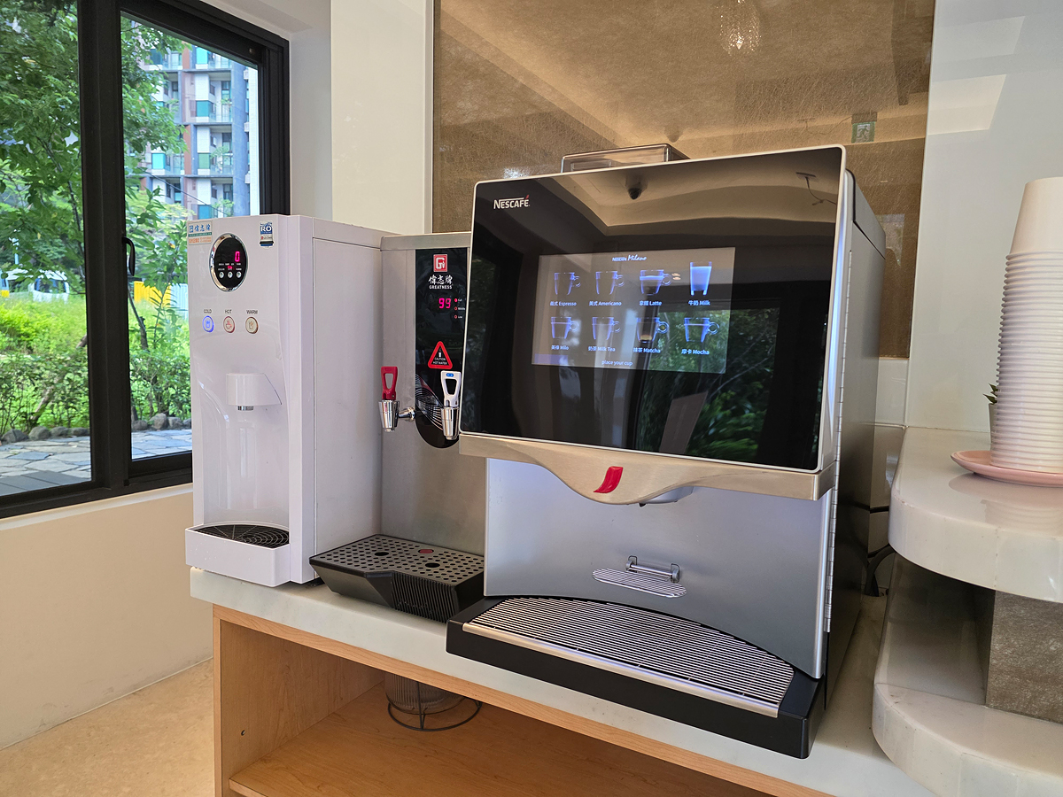休閒空間也有咖啡機可以泡牛奶、咖啡等配著煮好的溫泉蛋享用。