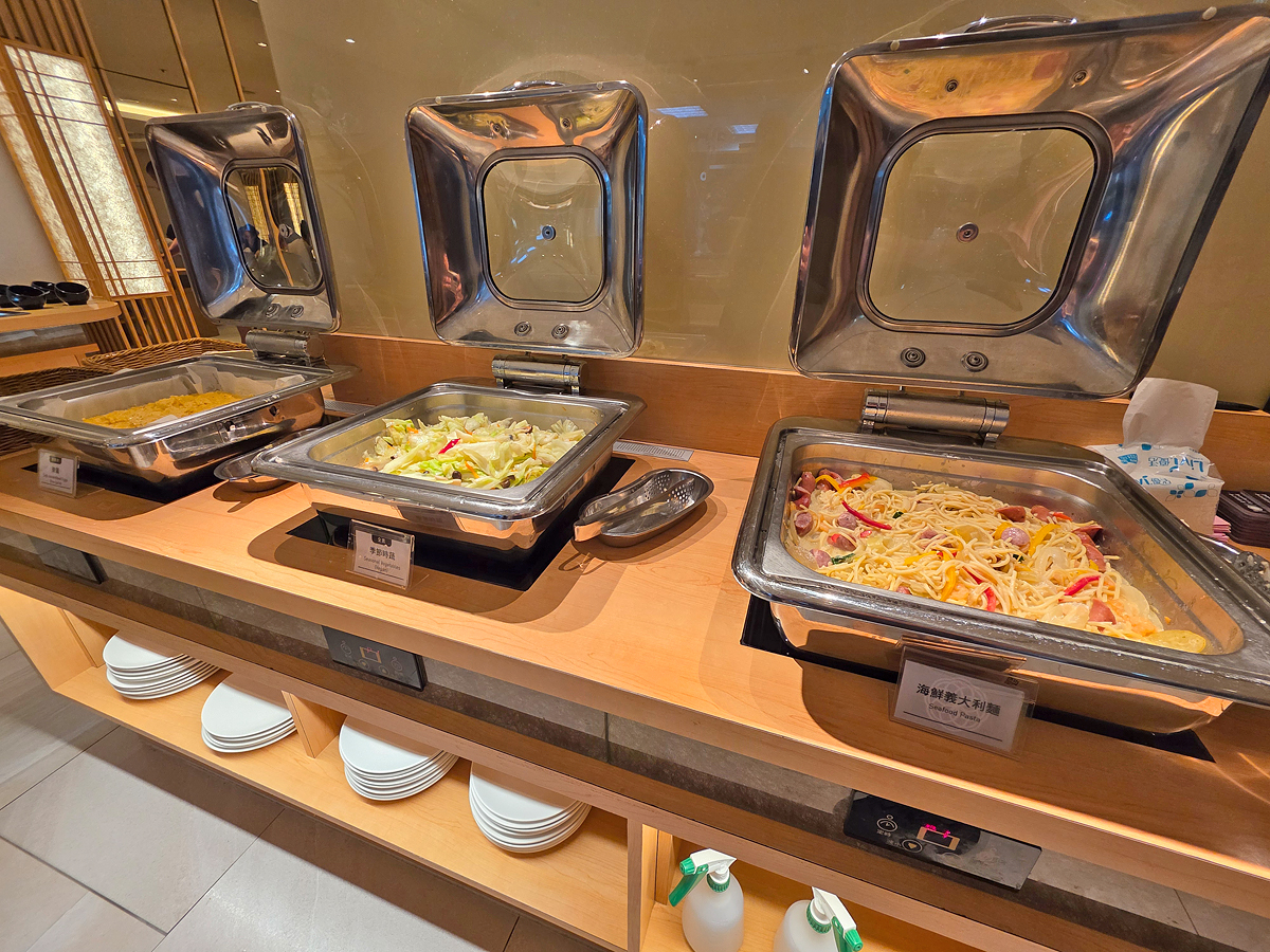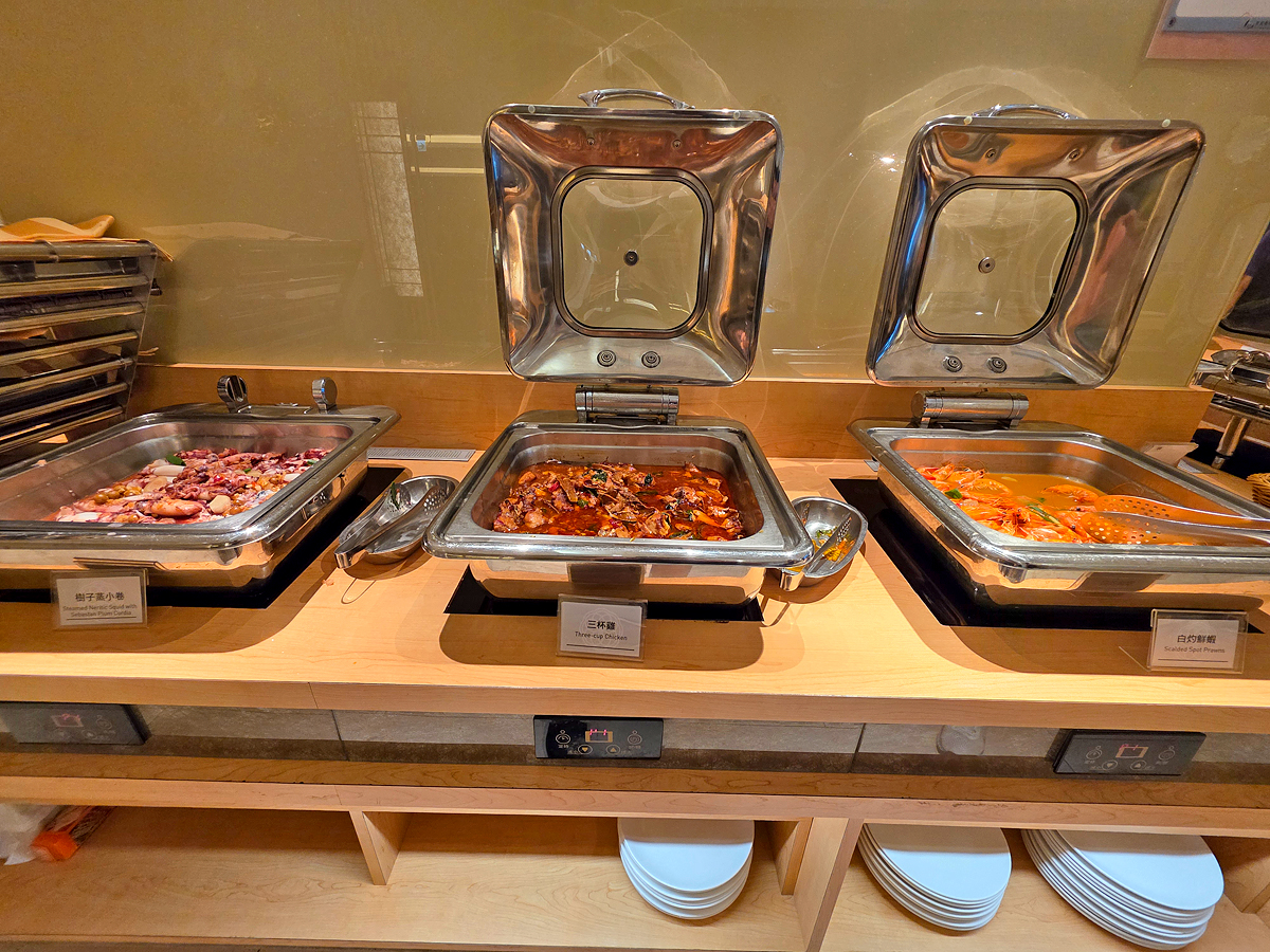 葛瑪蘭風呂會館的早餐提供各種不同品項的熱食,像是鮮蝦、三杯雞、煮小卷等(每季不同,以現場提供為準)。