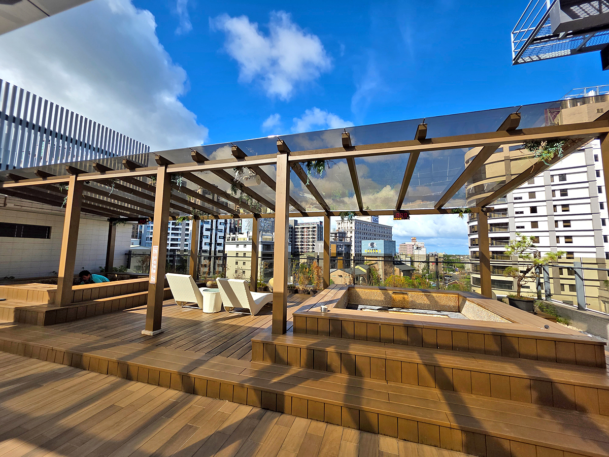 頂樓的「露天溫泉區」有多座溫泉池,有各種不同水療SPA功效,也有不同溫度的泉池,在頂樓享受空中花園溫泉,享受開放式的泡湯風情。