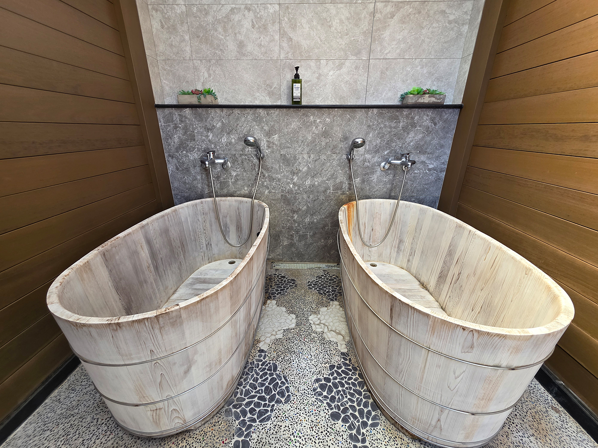 葛瑪蘭溫泉飯店的溫泉湯屋每間獨立,裡面是提供2個檜木桶可以泡湯。