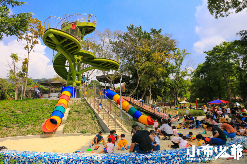 這裡很適合全家來踏青遊樂,小朋友有溜滑梯、沙坑、攀岩牆、戲水池、大草坪、泡泡足球可以玩,大人則可在樹林野餐區休憩享用輕食小點,坐在樹蔭下吹著涼風好不愜意,且樹林野餐區旁還有不少攀爬擺盪遊具,讓小朋友盡情放電。