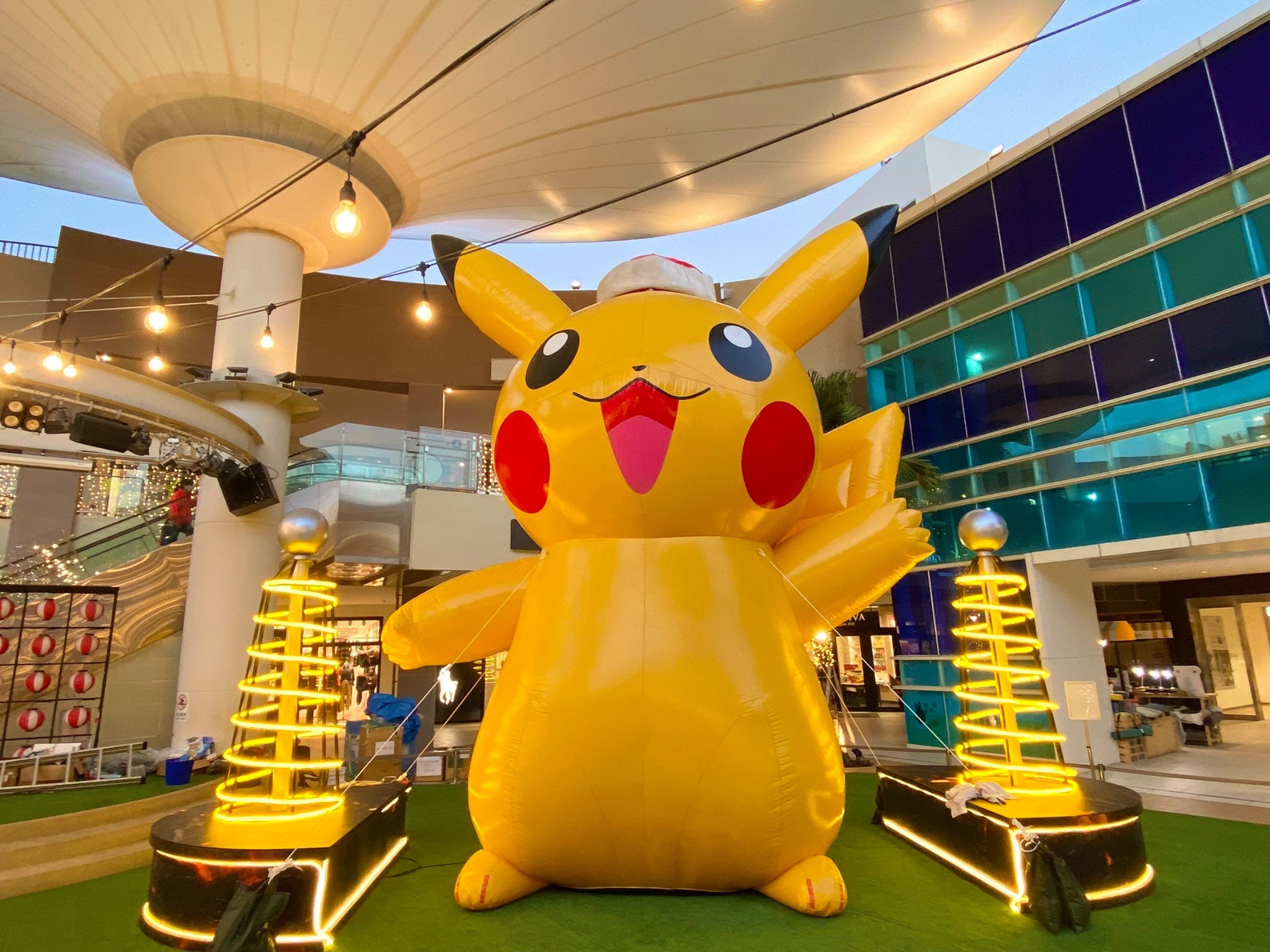 此次聖誕主題為-寶可夢禮物派對嘉年華,現場氣氛很歡樂,西口噴水池化身為星願之池,巨大的皮卡丘就在中庭廣場上,二側搭配發電裝置,既逗趣又可愛,另一側8公尺高的聖誕樹點燈時閃亮亮的好耀眼。