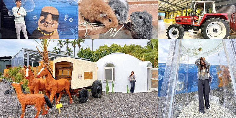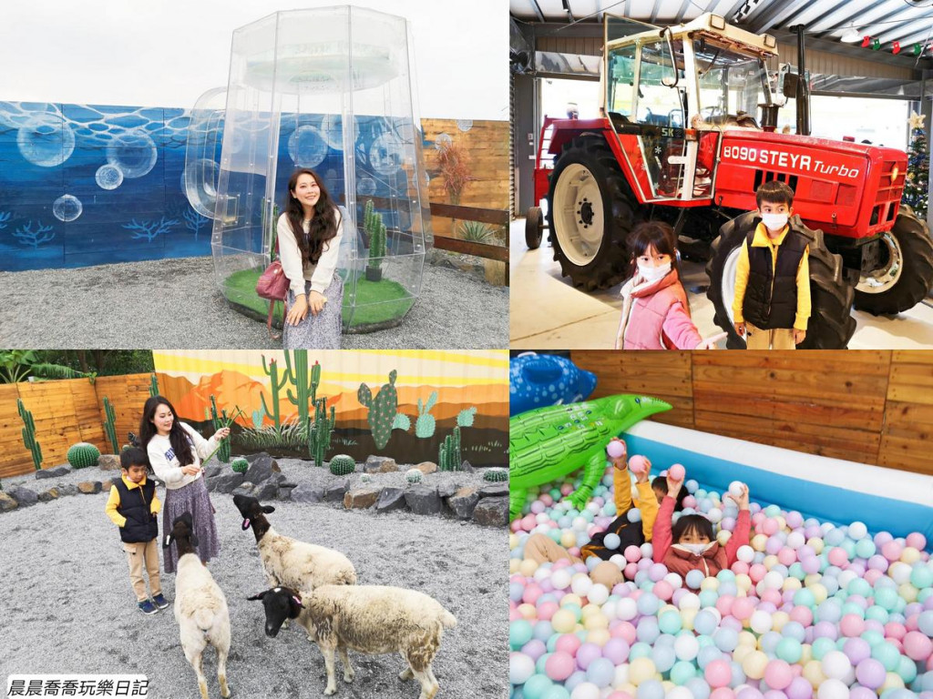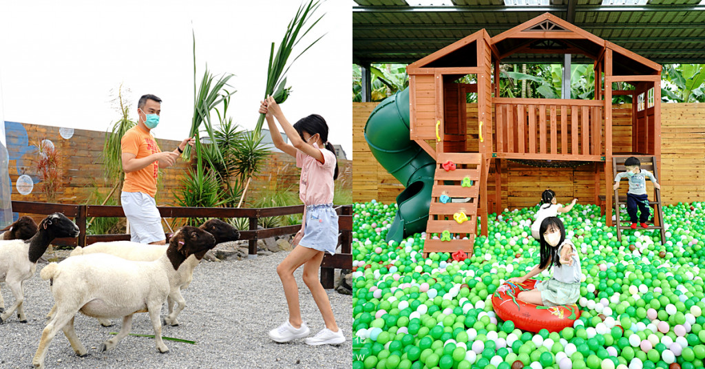 鐵皮屋外觀漆上亮黃色在路上非常醒目,入口處擺放一台大型農耕機與拖車,歡迎大家坐上去拍照;往內走是半室內空間有溜滑梯球池與盪鞦韆,讓小朋友遊玩放電趣,且遊戲區上方有屋頂,雨天也能玩。動物互動區在戶外,有羊咩咩、象龜、天竺鼠、狐獴、水豚、梵天雞,以及顏色漂亮可愛的鸚鵡區,只要拿起飼料,牠們就會飛到你的手上,對小朋友來說是很特別的體驗。