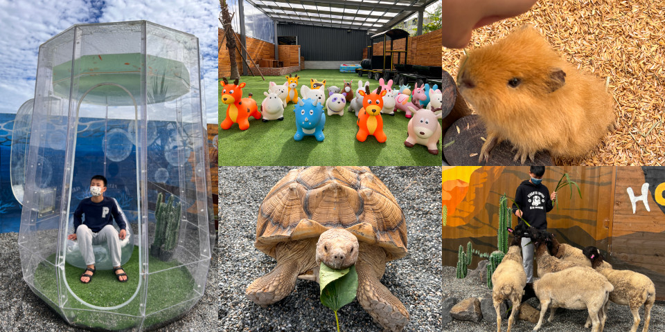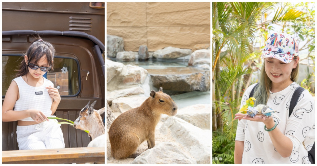 動物互動區在戶外,有羊咩咩、象龜、天竺鼠、狐獴、水豚、梵天雞,以及顏色漂亮可愛的鸚鵡區,只要拿起飼料,牠們就會飛到你的手上,對小朋友來說是很特別的體驗。