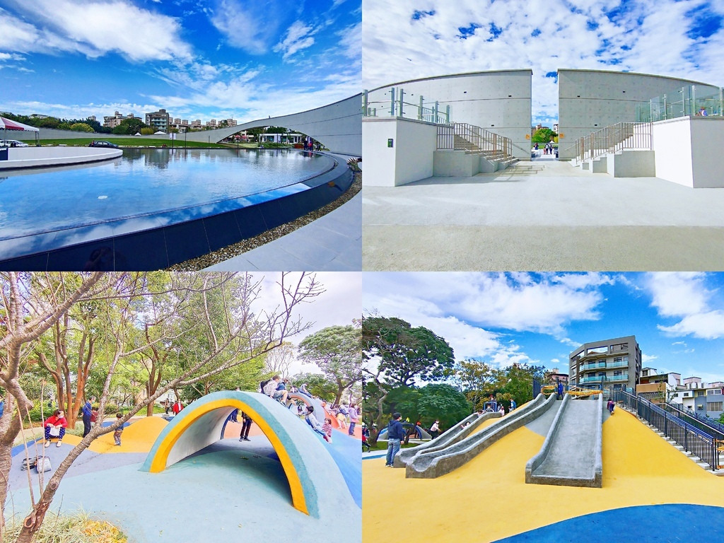兒童遊戲場分為3大主題區,溜滑梯區是一座大型的山丘磨石子溜滑梯,設有1寬、2窄滑道,後方有攀岩牆及單索攀爬;沙坑區範圍不小,上方還有平衡木及跳樁可以玩;山丘區有不同高低、大小的彩色山丘,小朋友好像在冒險一樣上下跑跳遊玩,最後還有2座鳥巢鞦韆。