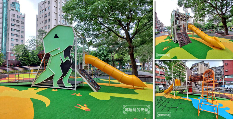 公園兒童遊戲場於2022年3月完成改裝開放,打造恐龍主題多功能攀爬溜滑梯組,Q版恐龍逗趣可愛,結合攀爬坡、繩網、波浪攀爬架與空中爬籠,下方還有個哈哈鏡,站在鏡子前映出來的人會變形,很有趣哦。