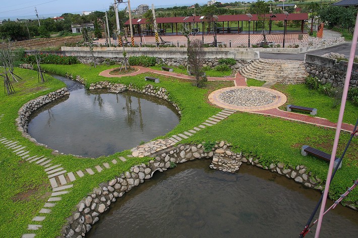 水車公園有很多的池塘,裡面都有不少的魚,小朋友來可以快樂的餵魚,另外還有一個設計成大船艦造型的大型兒童遊樂設施,還有一個簡單的汲水幫浦跟小水流區可以讓小朋友玩玩水。