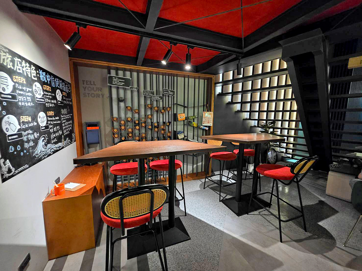 悅樂旅店在B2打造一個休憩空間,分為「享食空間、書想室、窩樂、同樂會」提供冷泡茶、咖啡、圖書繪本、桌遊、Switch遊戲機等,晚上會播放電影,且22:00-23:00還會提供多款免費的泡麵當消夜,不怕餓著肚子睡覺。
