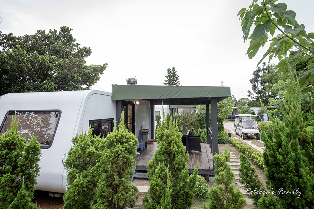 莊園露營車分有雙人及四人車型,每台車之間皆利用植栽區隔成半獨立空間,無擁擠感更自在,若是2個家庭一起入住,也有相連的露營車可以選擇。車內空間裝潢採現代簡約風,有冷氣、寢具、大電視、獨立衛浴、有遮陽的戶外庭院,非常舒適。