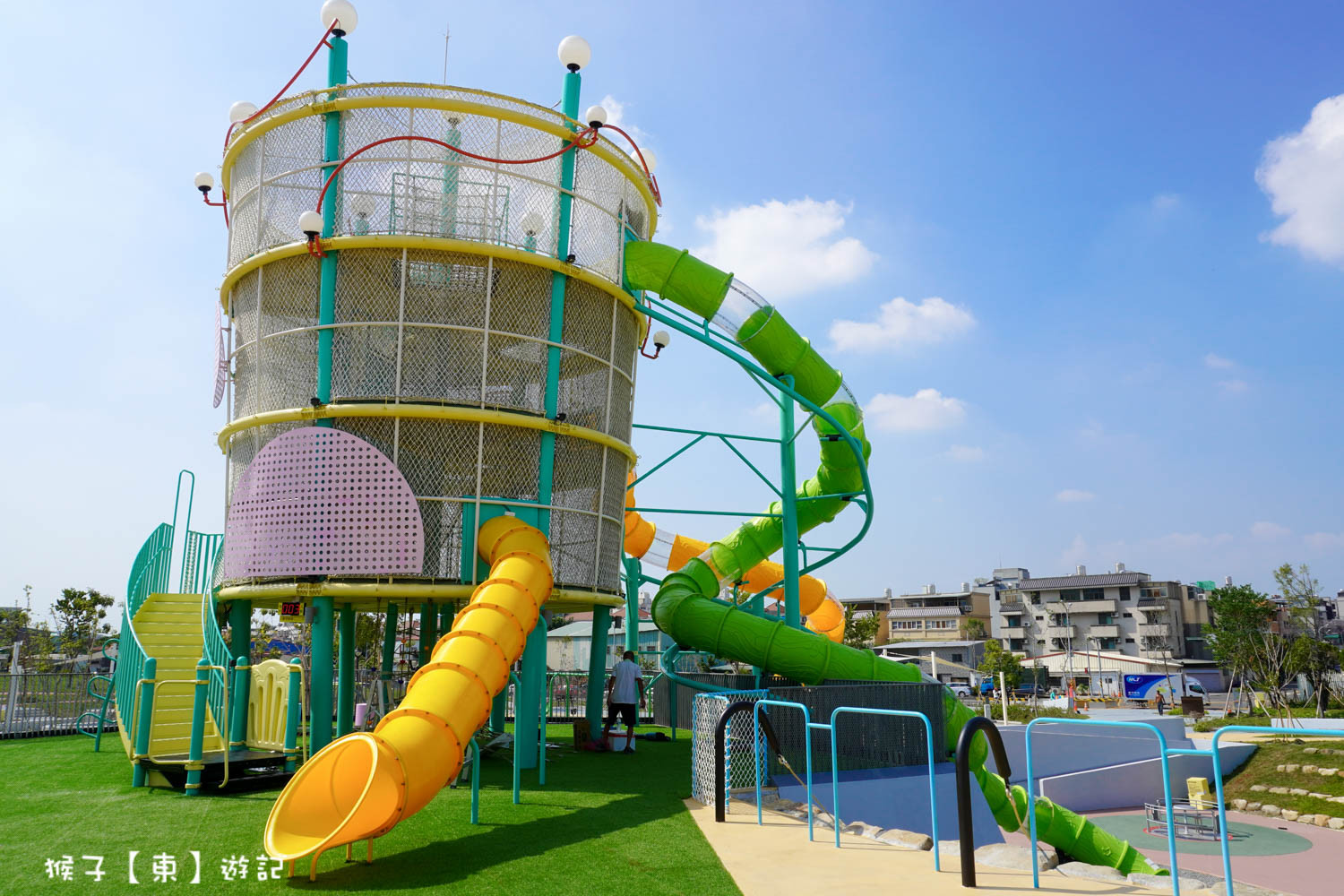 走入公園內最吸睛的就屬11公尺高的高塔溜滑梯,塔內結合攀爬闖關等設施,塔外連接3座不同高低隧道溜滑梯,滑梯下使用細礫石舖面,周邊還有繩網爬架、攀岩牆、砂岩攀岩牆、磨石子溜滑梯、多人旋轉盤。