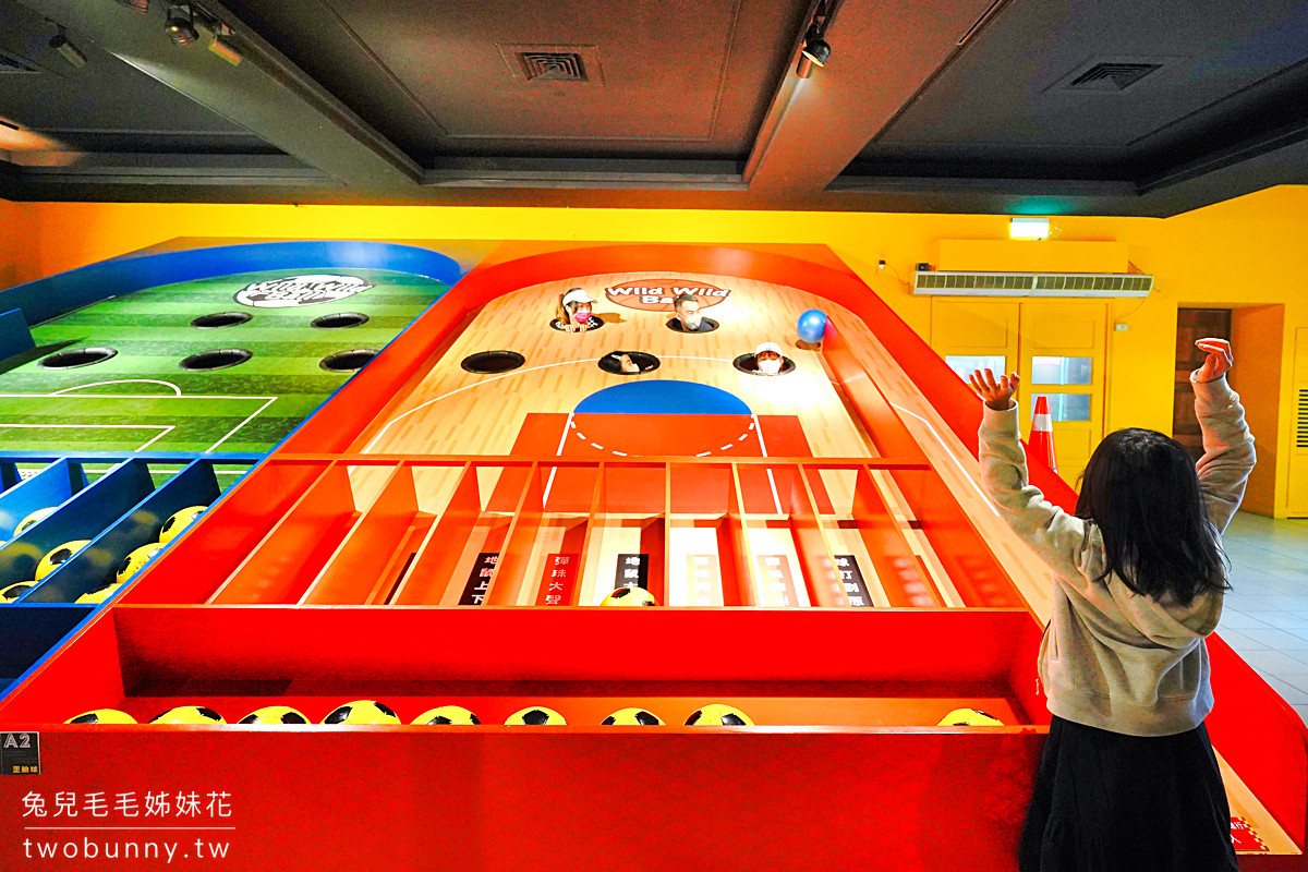 館內共設計12道關卡,每關都是跟球有關的遊戲,一開始先帶大小朋友認識各種球類運動,接著開始闖關嘍!裡面最好笑的就屬「歪臉彈珠台」,這個彈珠台不只是大,重點是還有人體地鼠,大人在下面丟球,小朋友變成地鼠在洞裡擋球,模樣超可愛!大人小孩也可互換角色哦。