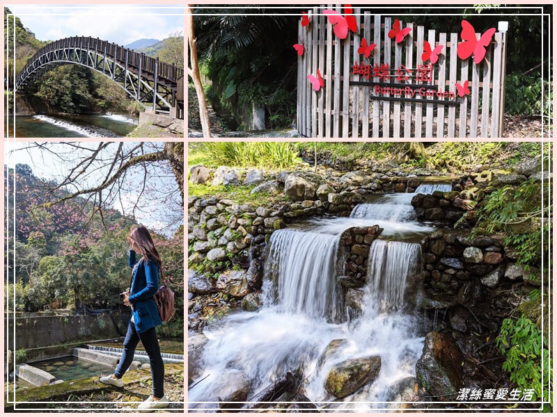 這個步道算輕鬆好走,大部份為緩坡路段,只有一小段階梯,單程約1公里。一路上有樹蔭以及小水圳伴隨,中後段有小巧清涼的三層瀑布,還有一處蝴蝶公園,每年6-8月可以看到不少蝴蝶,步道最後是景觀拱橋,搭配後方山林景色,真是漂亮。