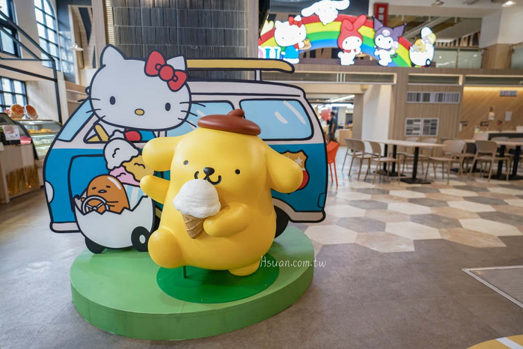 服務區建築外觀就可以看到Hello Kitty、美樂蒂、布丁狗、蛋黃哥等三麗鷗家族跟大家打招呼,外牆也能找到他們可愛的身影。南北區室內裝飾略有不同,南區1樓是QQ的布丁狗與Hello Kitty。