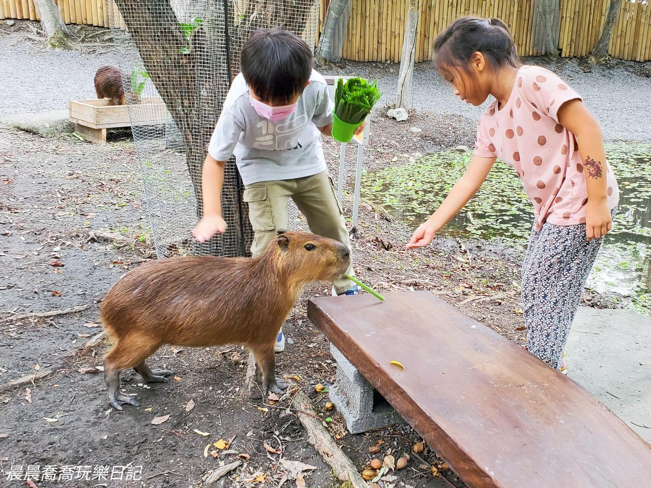 入園門票含牧草及飲料兌換,可愛動物區就在落羽松林的圍繞下,充滿悠閒的氣氛,小動物們就在裡面自由的走動,吸引小朋友的目光,可以看到水豚、狐獴、紅鶴、笑笑羊、黑腹山羊、羊駝、孔雀、梅花鹿、柯爾鴨、驢子等動物,大部份都可以互動餵食哦。