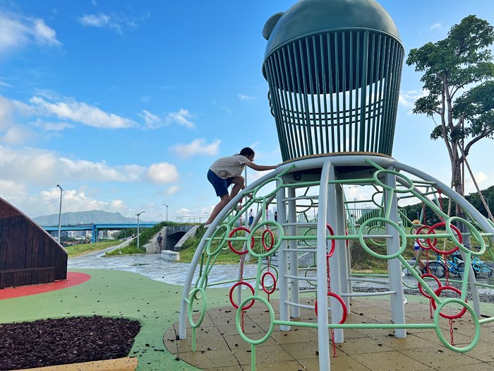 台北市全新蛙蛙主題特色公園-蛙仔坑生態遊戲場於2023年9月開放遊玩!結合青蛙意象的遊樂設施可愛又好玩;一旁的河濱公園適合騎車吹吹風;近松山機場不時看到飛機起降,還有網美風繩網休息區。