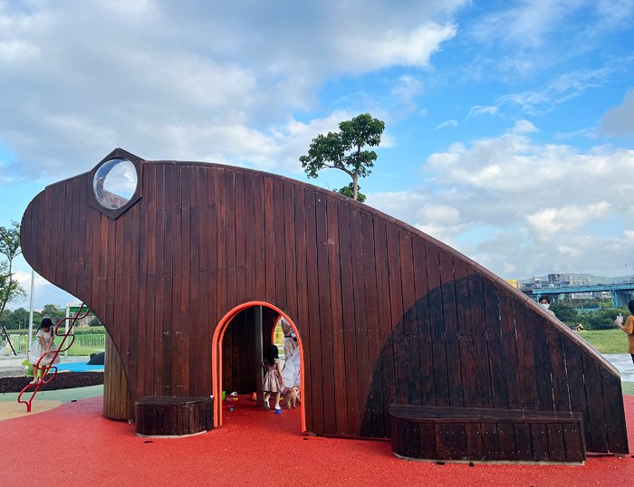 台北市全新蛙蛙主題特色公園-蛙仔坑生態遊戲場於2023年9月開放遊玩!結合青蛙意象的遊樂設施可愛又好玩;一旁的河濱公園適合騎車吹吹風;近松山機場不時看到飛機起降,還有網美風繩網休息區。