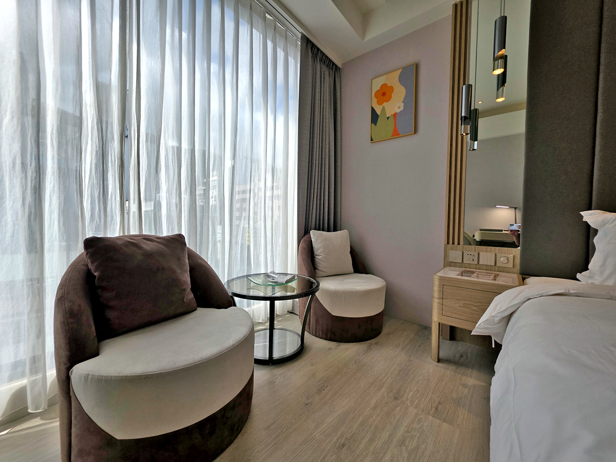 「經典雙床房」的房型會配置休息用的桌椅,一家人來入住也可以在這裡休息聊天。