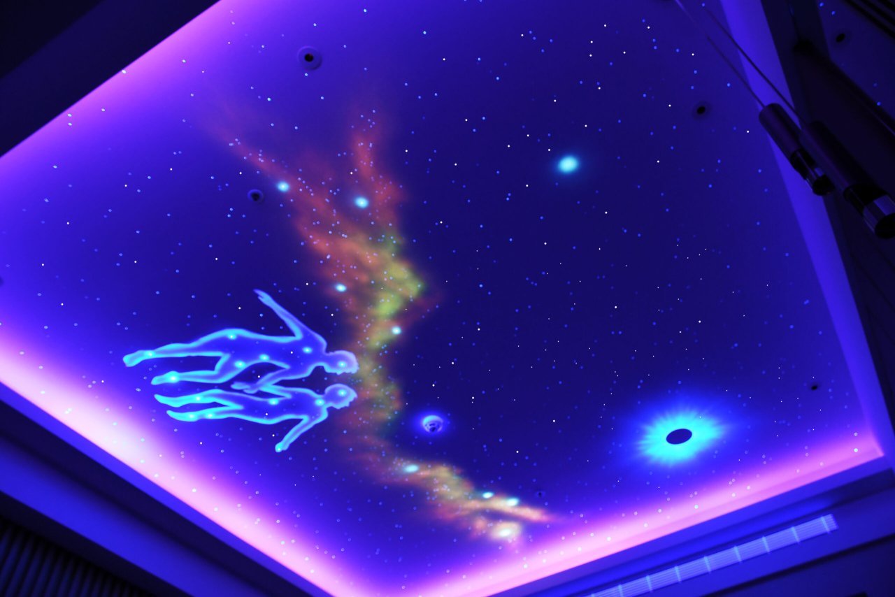 「葛瑪蘭之星飯店」所有的房型都會請星空彩繪畫家創作的獨一無二主題星空,在關燈後在天花板就會浮現出專屬星宇空間,非常療癒。