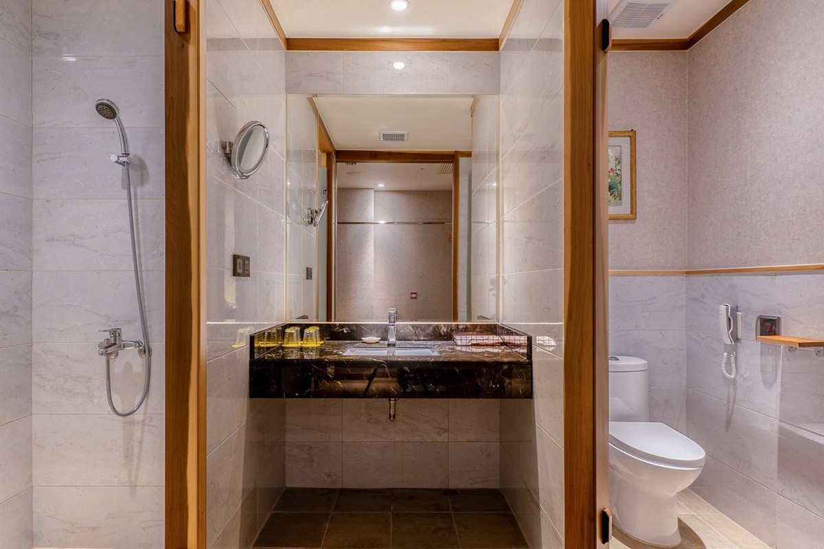 飯店大廳高挑氣派,裝潢充滿中國古典之美,使用大幅的水墨畫、優美的中國紋、圓形拱門、中式傢俱等,營造優雅華麗之姿。入住的房型有雙人及家庭四人房型,房內擁有11坪的寬敞空間,質樸的大地色系,讓你一夜好眠。
