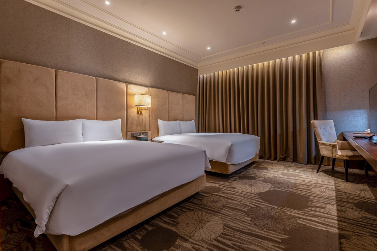 有小孩的家庭客人建議可以選擇「經典家庭客房」,此房型房內空間約11坪,配置2中床。飯店客房採用質樸的大地色系,讓你一夜好眠。