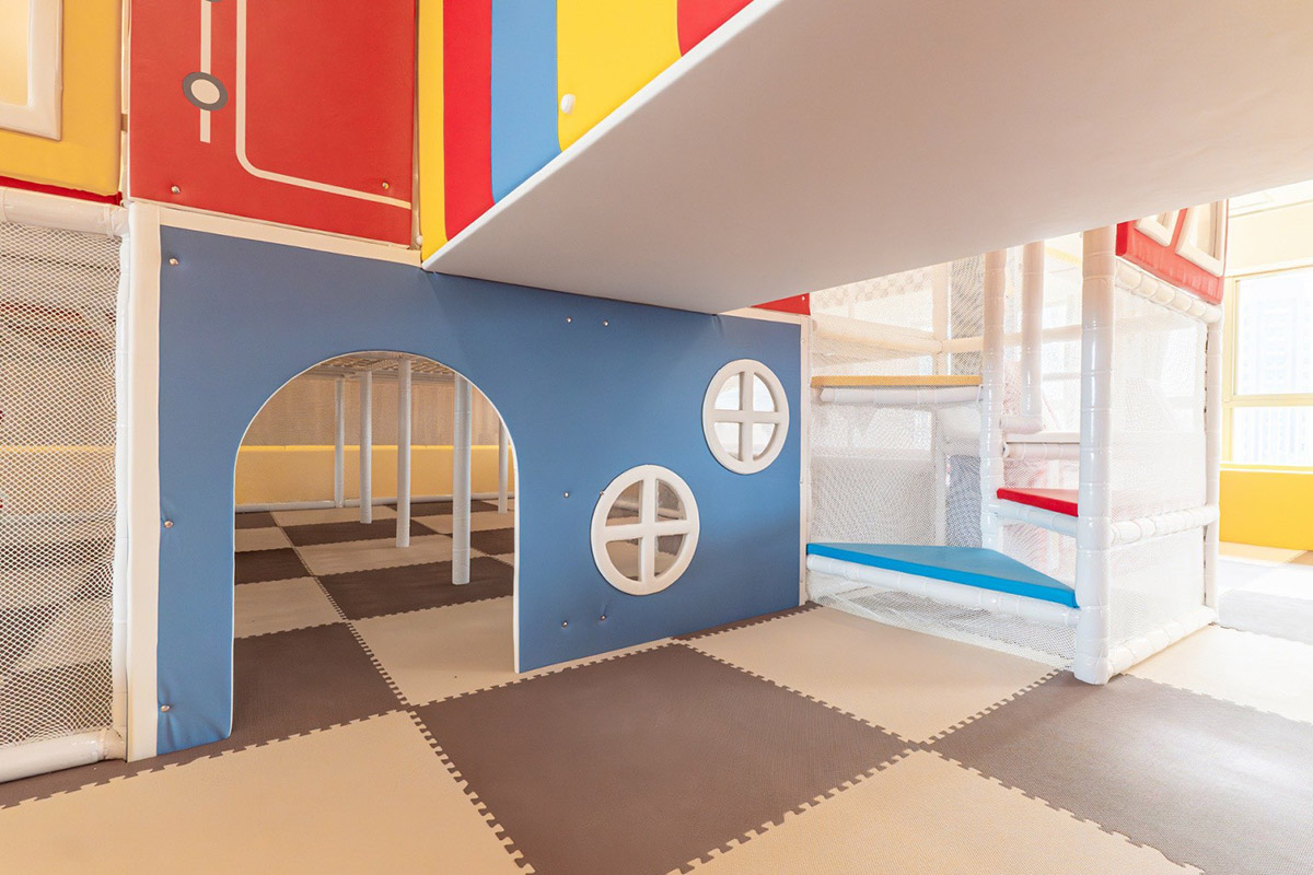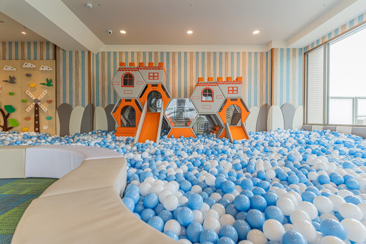 「漂浮溜滑梯」後面是色彩繽紛的闖關障礙區空間。