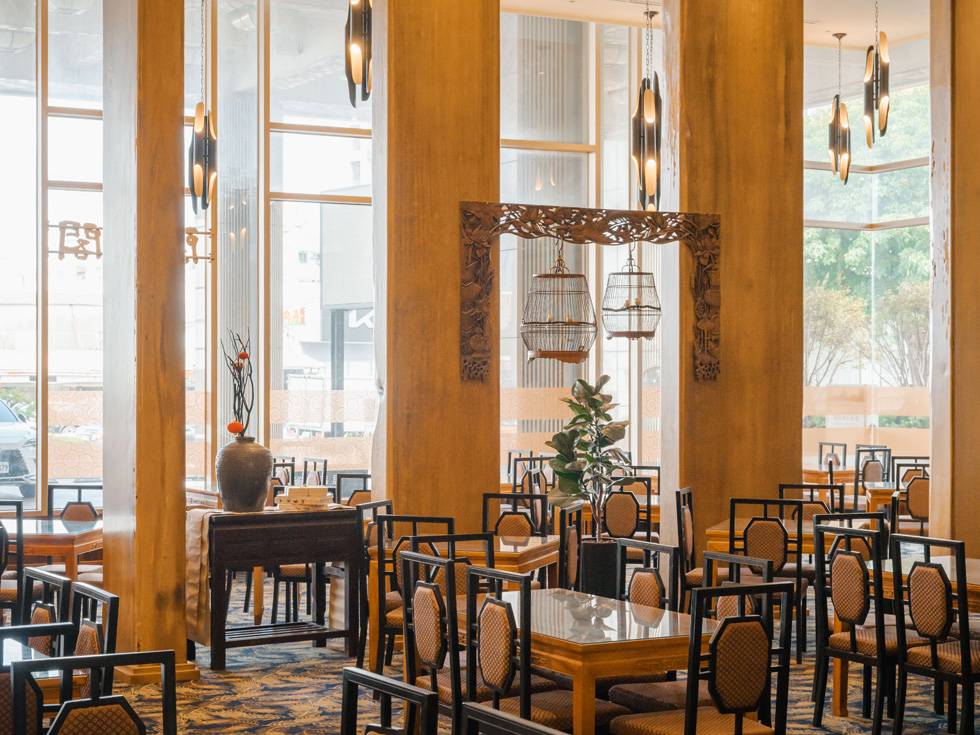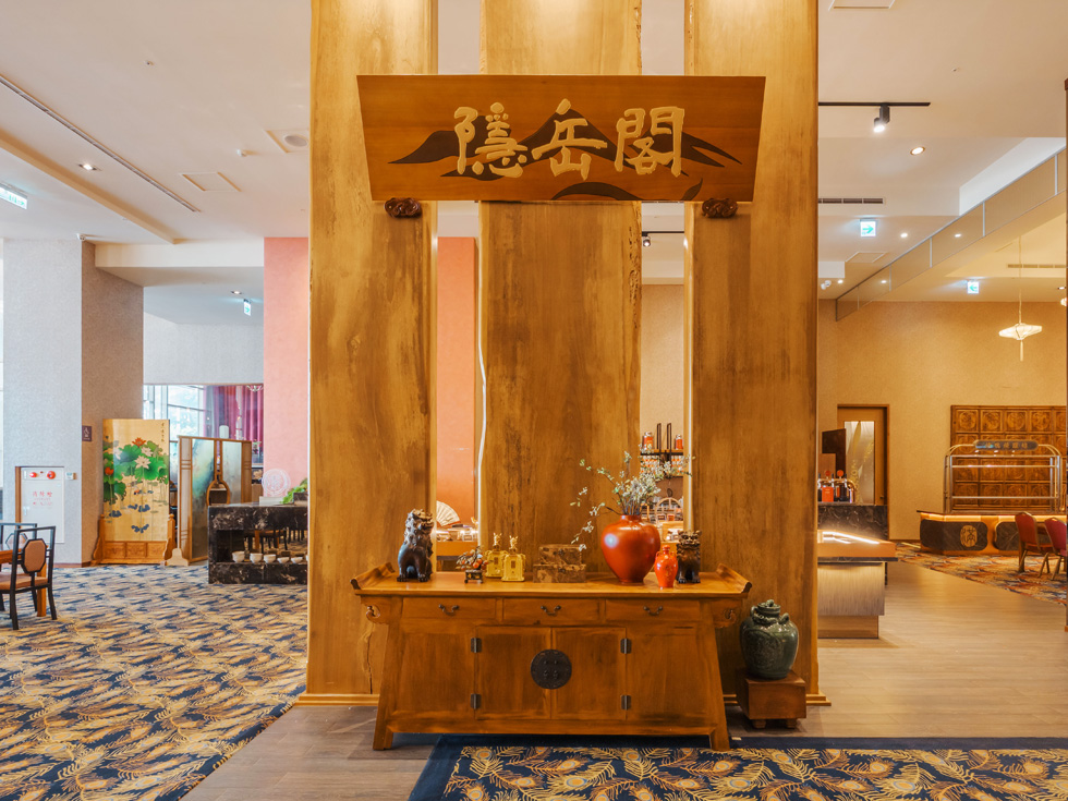 使用大幅的水墨畫、優美的中國紋、圓形拱門、中式傢俱等,營造優雅華麗之姿。