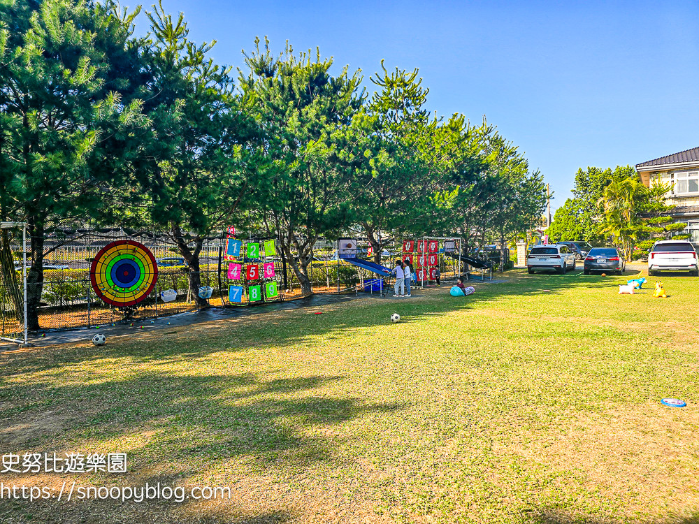 走入興品園,眼前是大片草皮空間,草皮上擺放跳跳馬、小球、足球門、彈跳床、投籃機等遊樂設施,小朋友看到就想跑去玩了;在屋簷下、在樹下則擺放不少休閒桌椅,方便遊客休憩聊天;一旁櫃台供應飲品、糕點、爆米花、薯條、冰棒等小點,讓大小朋友補充體力。