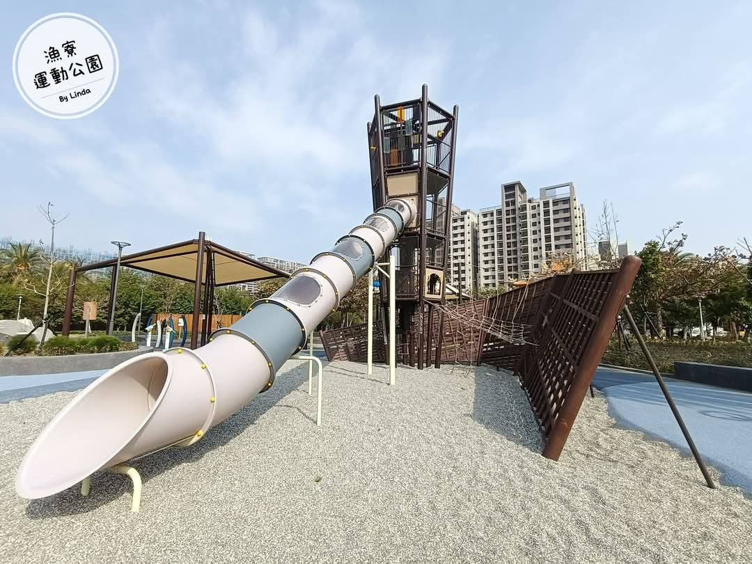 遊戲場分為船長奇航、捕魚遊戲塔、水戰綠洲、鞦韆等4個主題區;適合大小孩挑戰的捕魚遊戲塔結合繩網、攀爬、闖關的關卡,好像在闖立體迷宮,最後再由溜滑梯滑下來,遊戲塔下方採用細礫石舖面,還可讓小朋友玩沙趣。