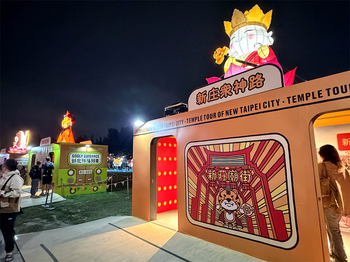 主燈區旁是今年首度與宮廟合作的「馬上開運」祈福列車,請宮廟內眾神尊駐駕至此賜福;除了參觀拍照,還能拜拜保平安、求知識、招財運。