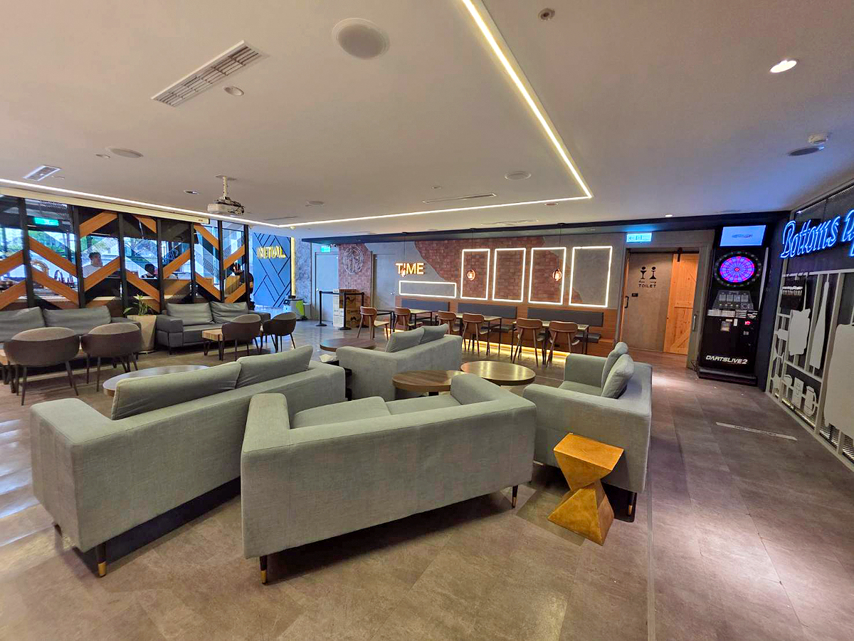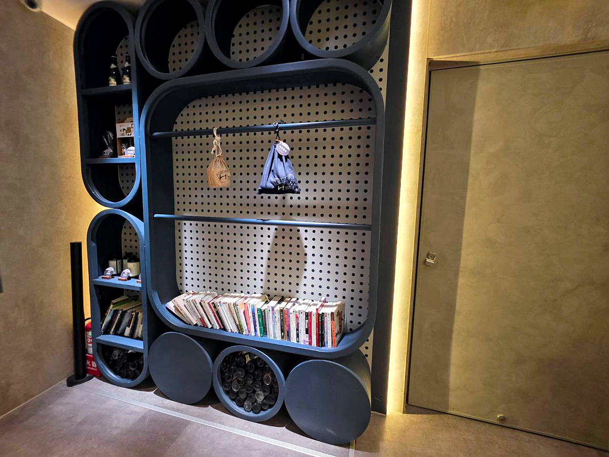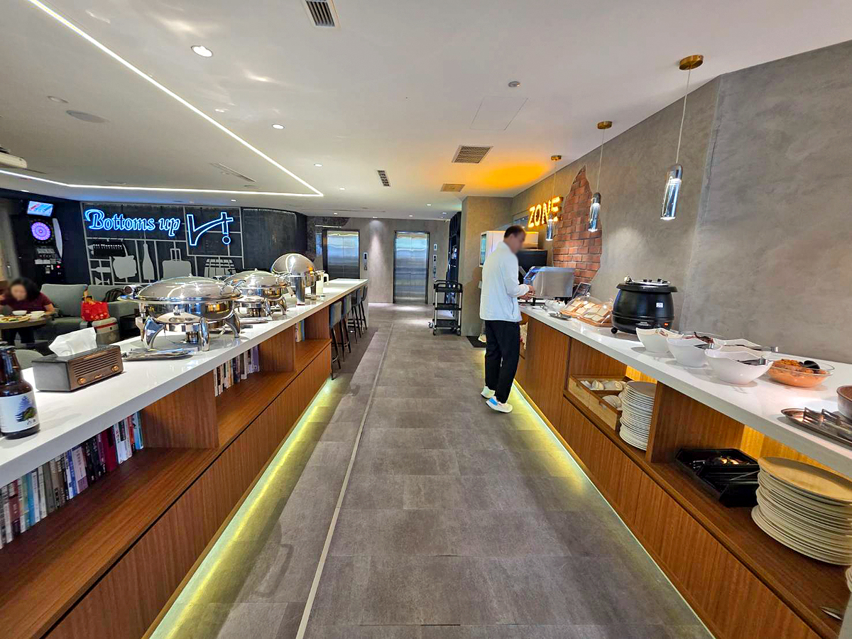 飯店大廳很有現代風,簡潔俐落的櫃台旁是啤酒吧,爸媽可以點杯啤酒或帶一瓶回房內喝,假日來杯啤酒超chill;小朋友可以拿取爆米花、小糖果與飲料吃吃喝喝也開心。後方沙發區方便大小朋友休憩使用,裡面還有投幣式飛鏢機可以玩。